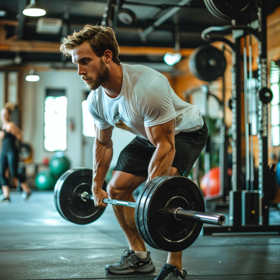 - Correct Form: Start with feet hip-width apart, gripping the barbell overhand. Keep your back straight, bending at the hips and knees to lift the weight, driving through your heels.
